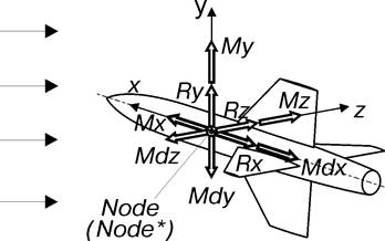 Продольная аэродинамическая сила Rx направлена вдоль вектора X узла Node*. Нормальная аэродинамическая сила Ry направлена вдоль вектора Y узла Node*. Поперечная аэродинамическая сила Rz направлена вдоль вектора Z узла Node*. Момент крена Mx и демпфирующий момент крена Mdx направлены вдоль вектора X узла Node*. Момент рыскания My и демпфирующий момент рыскания Mdy направлены вдоль вектора Y узла Node*. Момент тангажа Mz и демпфирующий момент тангажа Mdz направлены вдоль вектора Z узла Node*. Значения аэродинамических сил и моментов определяются на основании характеристик среды, заданных коэффициентов аэродинамических сил и моментов. Продольная, нормальная и поперечная аэродинамические силы приложены в центре узла Node*.
