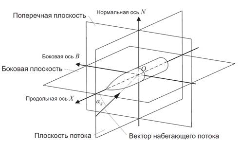 , схематично изображенной на рис. 1. Продольная ось OX совпадает с осью симметрии ЛА и направлена вперед. Плоскость потока – плоскость, образуемая продольной осью ЛА и вектором скорости набегающего потока. Нормальная ось ON перпендикулярна продольной оси, лежит в плоскости потока и направлена в сторону вектора скорости набегающего потока. Боковая ось OB ортогональна осям OX, ON и дополняет их до правой тройки. Поперечная плоскость перпендикулярна продольной оси. Боковая плоскость образуется боковой и продольной осями.