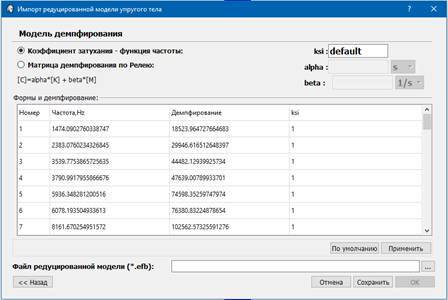 На заключительном этапе пользователь определяет параметры модели демпфирования (рис. 10). С помощью переключателя можно выбрать тип модели: коэффициент затухания (по умолчанию для каждой формы коэффициент затухания вычисляется по ее частоте) или модель демпфирования по Рэлею (матрица демпфирования равна сумме матриц жесткости и масс с заданными коэффициентами).