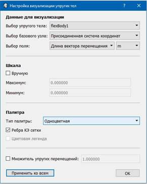 Данные настройки индивидуальны для каждого деформируемого тела, однако с помощью клавиши «Применить ко всем» их можно распространить на остальные упругие тела, имеющиеся текущем проекте. Если при этом в качестве базового узла для визуализации выбран один из интерфейсных узлов, что в общем случае не может быть распространено на другие деформируемые тела, данная настройка сбрасывается на значение по умолчанию – отображение относительно присоединенной системы координат. Легенда отображается для выбранного в данный момент упругого тела.