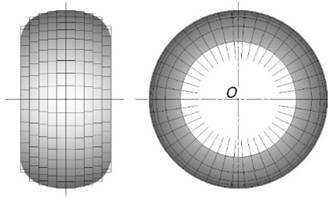 В программном комплексе EULER расчет взаимодействия колеса с опорной поверхностью производится при помощи теоретических (физических) моделей. Данные модели включают в себя жесткий обод колеса, жесткое кольцо брекера и щеточную модель протектора, контактирующего с опорной поверхностью. Общая схема принятых моделей представлена на рис. 1. Обод колеса и кольцо брекера в общем случае представляются отдельными звеньями, имеющими между собой упругую связь. С дорогой взаимодействует звено кольца брекера. Шина равномерно разбивается на дискретные элементы по ширине и окружности, как это представлено на рис. 2. Эти элементы можно интерпретировать как ворсинки «щетки». В модели принято, что элементы обладают упругими свойствами во всех направлениях и могут деформироваться независимо от соседних элементов. Внешняя сторона элементов шины (протектор) сцепляется с опорной поверхностью силами трения. Силы, действующие на элементы со стороны опорной поверхности, передаются на кольцо брекера.