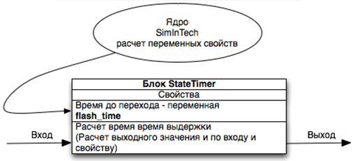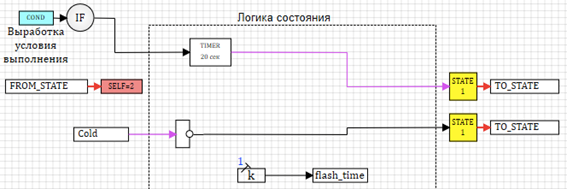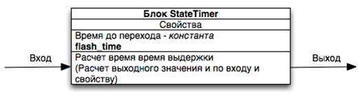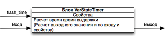 Для того, чтобы изменять свойство блока при работе в коде Си необходимо явно указать, что сигнал flash_time изменяется в ходе работы кода, для генератора кода данное свойство превращается в обычный вход, и неопределённость со свойствами блока снимается. Схема работы блока «Выдержка состояния» будет выглядеть так, как представлено на рис. 30.