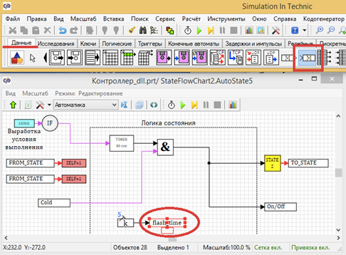Войдите в субмодель автомата индикации и далее в состояние «выключен». Удалите блок «Выдержка состояния» и установите блок «Переменная выдержка состояния» из закладки «Конечные автоматы». Поместите так же на схему блок «Чтение из списка сигналов» из закладки «Данные». Установите в качестве имени сигнала flash_time. Схема должна выглядеть как показано на рис. 34.