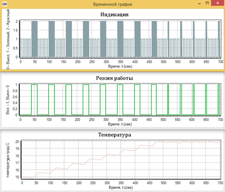 Откройте проект Нагреватель_загрузчик_dll. Запустите его на расчет и убедитесь, что теперь автомат индикации работает правильно и меняет частоту индикации в зависимости от режима. (рис. 36).