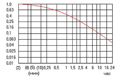 Величины предельных СКЗ виброускорений, соответствующие граничным уровням безопасности, усталости и комфорта, зависят от продолжительности воздействия вибрации. С увеличением времени действия вибрации величины предельных СКЗ виброускорений, соответствующие граничным уровням, уменьшаются в соответствии с графиком, приведенным на рис. 2.