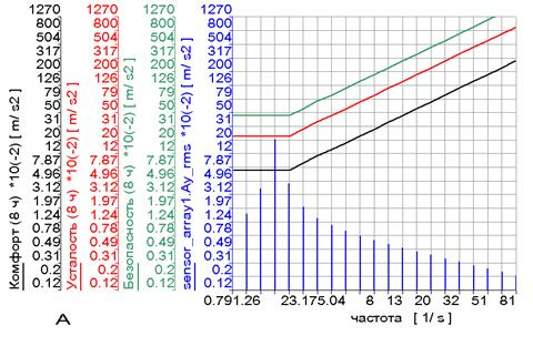 Данную оценку вибронагруженности удобно изображать на графике в виде 1/3 октавных полос СКЗ виброускорений и граничных уровней вибронагруженности для конкретной продолжительности вибрационного воздействия во всем рассматриваемом диапазоне частот. Пример оценки с помощью СКЗ вертикальных виброускорений приведен на рис. 3.