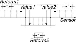 intervalSwitchM(Reform1, Reform2, Sensor, Value1, Value2, gauge=…, timer=…, work=...)