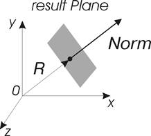 Данный метод создает плоскость, перпендикулярную заданному вектору Norm и отстоящую от начала системы координат проекта, в котором создается плоскость, на расстояние R в направлении этого вектора. Если значение R меньше нуля, то создается плоскость, находящаяся от начала системы координат проекта на расстоянии abs(R) в направлении, противоположном направлению вектора Norm. Ориентация плоскости совпадает с вектором Norm. См. рис. 1.