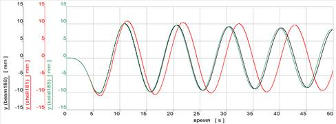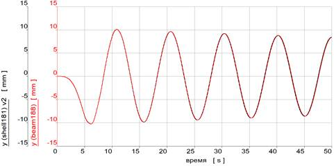 На рис. 5 показаны перемещения свободного конца доработанной модели из элементов shell181 (черным цветом) и модели из элементов beam188.