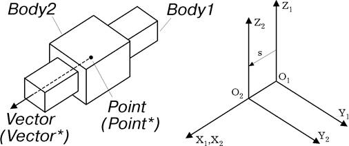 1. Создается узел O1X1Y1Z1 (см. рис. 2), который прикрепляется к звену Body1. Центр этого узла O1 совпадает с точкой Point*, а ось X1 – с вектором Vector*.
