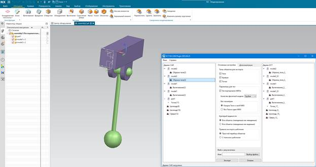 Пример реализации для CAD NX 2306. После запуска конвертера найдем интересующие нас элементы в структуре исходной модели САПР, отображенной в левой развернутой части окна конвертера (секция «Дерево модели»). При нажатии на элементы исходной модели в «Дереве объектов», они выделяются цветом на виде модели САПР (см. рис. 11).
