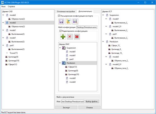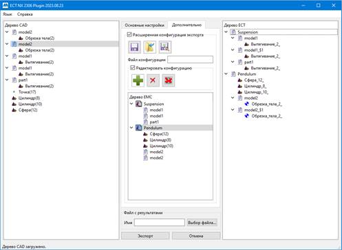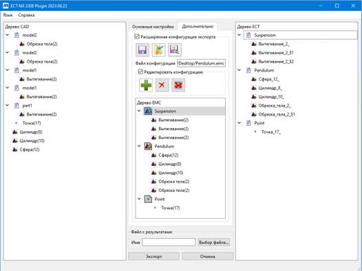 Клик мышкой по элементу дерева САПР model1.Вытягивание(2) выделяет цветом на модели САПР одно из искомых «ушек». Аналогичным образом находим второе искомое «ушко», которое будет иметь точно такое же полное имя, т.к. для создания этих объектов использован один и тот же файл детали. Далее находим параллелепипед – part1.Вытягивание(2) и т.д. На рис. 11 также показаны установки вкладки «Основные настройки». Обратите внимание, что если на вкладке «Дополнительно» стоит флажок «Расширенная конфигурация экспорта», то иерархическая структура ожидаемого результата конвертации в «Дерево ECT» определяется содержимым раздела «Дерево EMC». Если «Дерево EMC» пустое, то и «Дерево ECT» будет пустым.