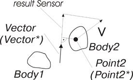 Значением датчика является проекция скорости точки Point2* на звене Body2 относительно звена Body1. Проекция осуществляется на вектор, зависящий от заданного значения необязательного именованного параметра fixingVector = … . Если параметр fixingVector = lockVector: или его значение не задано, то значением датчика является проекция скорости на вектор Vector*. Если параметр fixingVector = unlockVector:, то значением датчика является проекция скорости на вектор Vector.Точка Point2* и вектор Vector* являются соответственно копиями заданных объектов Point2, Vector и совпадают с ними в момент создания. Точка Point2* создается при переводе проекта из режима редактирования в режим исследования и прикрепляется к звену Body2. Если у датчика необязательный именованный параметр fixingVector = lockVector: или его значение не задано, то при переводе проекта из режима редактирования в режим исследования создается вектор Vector* и прикрепляется к звену, определяемому по необязательному именованному параметру bodyFixVector к Body1, если bodyFixVector = firstBody:, и к Body2, если bodyFixVector = secondBody:.