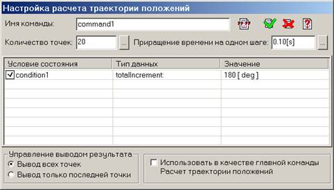 Поле Управление выводом результата содержит две кнопки. Если нажата кнопка Вывод всех точек, то при расчете траектории положений будут выведены все точки команды. Если нажата кнопка Вывод только последней точки, то при расчете команды будет выведена только последняя точка траектории положений, а промежуточные точки будут скрыты от пользователя.