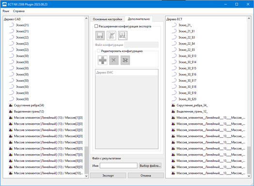 В общем случае экспорт модели из CAD в EULER может осуществляться несколькими способами. Первый был рассмотрен выше – это в режиме «Основные настройки» с генерацией ECT-файла. Однако в некоторых случаях, может быть удобнее выделять какие-то объекты CAD в отдельные группы с целью более удобного использования в EULER. Для этой цели в конвертере во вкладке «Дополнительно» можно сформировать EMC-дерево, которое позволяет объединять геометрические объекты в группы при записи в ECT-файл. EMC-дерево можно сохранить в файл с расширением «*.emc». EMC-файл представляет собой своеобразный фильтр, с помощью которого будет производится интересующая нас группировка элементов модели в результирующем ECT-файле. Следует иметь в виду, что создание EMC-файла влияет на содержимое ECT-файла.