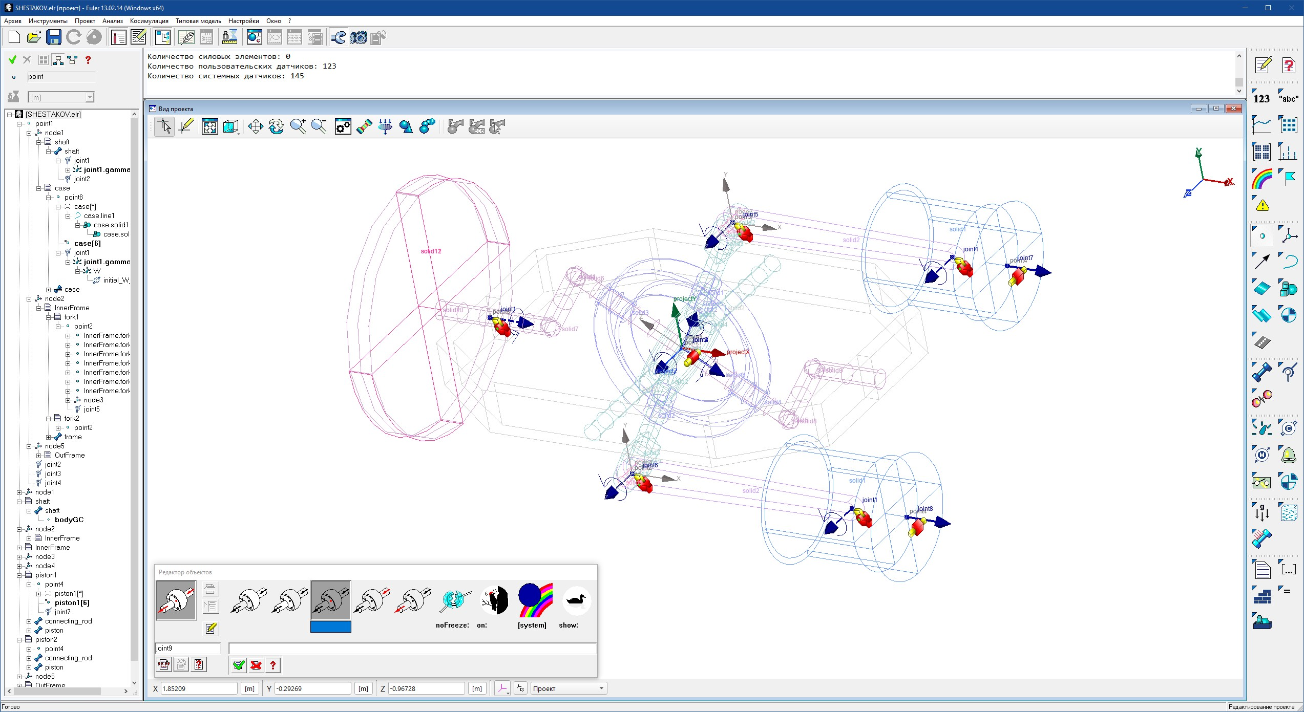 В окне Редактор объектов можно работать со всеми объектами активного проекта, включая объекты, описанные в агрегатах. Редактировать разрешается только те объекты, которые созданы непосредственно в корневой части проекта. В корневую часть проекта помещаются и вновь созданные объекты ММС. Редактирование и создание объектов допускается только в режиме редактирования проекта. В режиме исследования проекта и режиме просмотра результатов окно Редактор объектов доступен на просмотр.