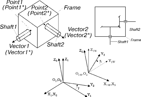 При создании шарнира задаются точки осей вращения Point1, Point2 и векторы направления вращения Vector1, Vector2 для каждого из валов. В модели используются копии этих объектов Point1*, Point2*, Vector1* и Vector2*, которые прикрепляются к звену Frame.