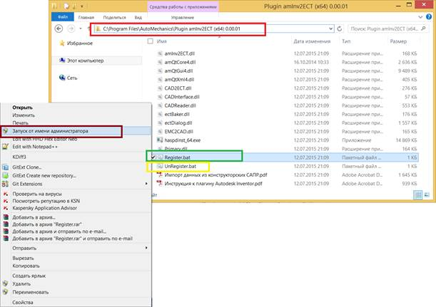 Найдите в директории файл под названием Register.bat (см. рис. 3, зеленый прямоугольник) и через контекстное меню (вызов меню осуществляется с помощью щелчка правой кнопки мышки по файлу) исполните его с правами администратора (см. рис. 3, коричневый прямоугольник):