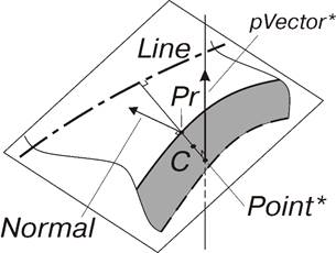 вычисляется как пересечение кратчайшего перпендикуляра от точки Point* до линии Line с границей паза. Расчеты производятся в плоскости перпендикулярной оси цилиндра. Нормаль Normal определяется как внутренняя нормаль к границе паза в точке