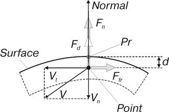 Элемент описывает контактное взаимодействие между точкой и поверхностью. Поверхность является ориентируемой. Она имеет наружную и внутреннюю стороны. Нормаль поверхности в каждой ее точке направлена наружу. Силовое взаимодействие определяется в предположении, что поверхность является наружной поверхностью некоторого тела (звена). Материал этого тела расположен со стороны внутренней поверхности. Силовое взаимодействие возникает при внедрении точки внутрь поверхности, то есть, если точка находится в материале тела, ограниченного поверхностью. На точку действуют следующие силы.− Сила упругой нормальной реакции со стороны поверхности, ее направление совпадает с направлением нормали поверхности в окрестности внедрения точки.