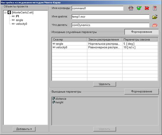 Для создания команды Исследование методом Монте-Карло необходимо выбрать команду, которая будет использоваться при расчете процесса функционирования ММС. Нужно также определить исходные случайные параметры и выходные параметры. Кроме того, следует указать имя файла, в который будут заноситься результаты расчета. После создания команды в меню Анализ будет добавлен пункт с этой командой.