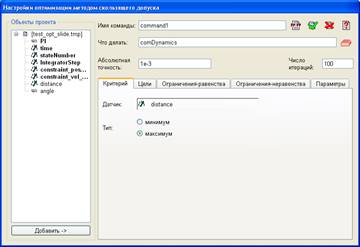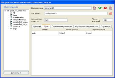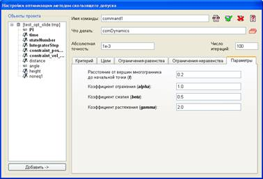 Для создания команды Оптимизация методом скользящего допуска необходимо выбрать команду, которая будет использоваться для расчета процесса функционирования ММС. Нужно также определить критерий, его тип, оптимизируемые параметры и, возможно, ограничения равенства и/или неравенства. Кроме того, для каждого параметра следует задать допустимые границы изменения. Вдобавок нужно указать параметры работы алгоритма оптимизации, к ним относятся абсолютная точность поиска решения и ограничения на количество итераций. После создания команды в меню Анализ будет добавлен пункт с именем созданной команды.