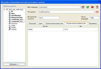 Добавить-> – добавляет объект, выделенный в списке Объекты проекта, в соответствующие поля вкладок критерия, оптимизируемых параметров, ограничений равенства и неравенства.