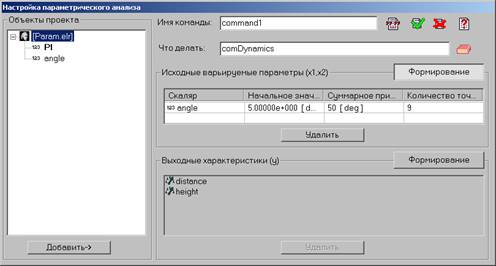Для создания команды Параметрический анализ необходимо выбрать команду, которая будет использоваться для расчета процесса функционирования ММС. Нужно также определить исходные варьируемые параметры и для каждого из них задать суммарное приращение и количество точек для расчета. Кроме того, следует выбрать выходные характеристики. После создания команды в меню Анализ будет добавлен пункт с этой командой.