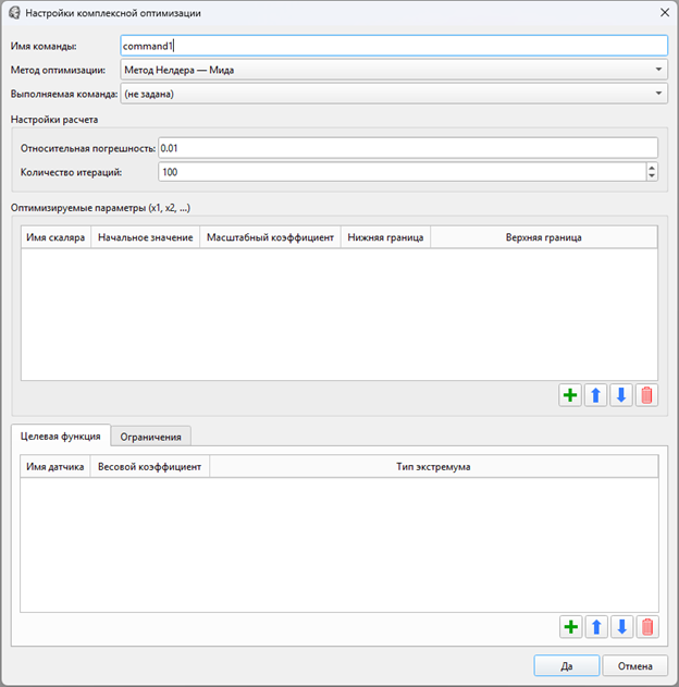 Для создания команды в меню Анализ выберите пункт Комплексная оптимизация с ограничениями / Создать. После этого откроется диалоговое окно Настройки комплексной оптимизации (рис. 13).