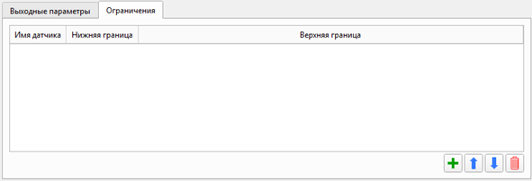 Содержит ограничения в виде неравенств для датчиков. Столбец Имя датчика содержит имя датчика. Столбец Нижняя граница содержит минимальное допустимое значение для датчика. Столбец Верхняя граница содержит максимальное допустимое значение для датчика.