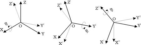 . Она представляется как результат трех последовательных поворотов при переходе от ориентации OXYZ к ориентации OX''Y''Z'' (рис. 5). Первый поворот выполняется вокруг оси OX на угол
