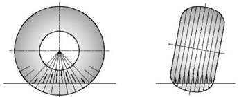 при деформации колеса плоской опорной поверхностью и нулевом угле наклона кольца. Такой расчет обеспечивает физически правдоподобную картину распределения упругих сил радиальной деформации шины. При деформации колеса плоской опорной поверхностью и нулевом угле наклона кольца обеспечивается совпадение полученных сил с задаваемой исходной характеристикой