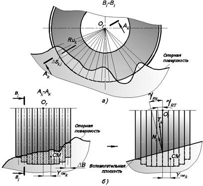 В каждом секторе строится вспомогательная плоскость, перпендикулярная его бисекторной плоскости и расположенная таким образом, что площадь деформации и боковое смещение центра площади, отсекаемой от сектора исходной поверхностью и вспомогательной плоскостью, равны между собой (рис. 11б). Угол