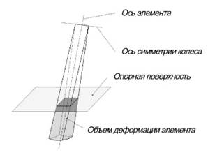 Элементарная сила прикладывается в окрестности точки пересечения оси элемента с опорной поверхностью. Детально это определено в конкретных моделях шины. Вектор элементарной силы располагается в меридиональной плоскости элемента и перпендикулярен линии пересечения этой плоскости с опорной поверхностью.