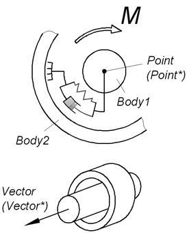 Данный элемент предназначен для моделирования трения, возникающего при относительном вращательном перемещении звеньев Body1 и Body2 вокруг вектора Vector. Момент трения направлен вдоль вектора Vector*, прикрепленного к звену Body2. Схематический вид элемента представлен на рис. 9.
