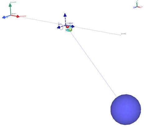 Объекты типа «Шарнир» при отображении на виде проекта могут иметь условные, символические изображения. Так, в каждый момент времени в символическом виде отображается информация о направлениях допустимых поступательных и вращательных перемещений, осях передачи вращения и прочее. Вектор, изображенный сплошной линией, обозначает поступательное перемещение вдоль этого направления. Вектор, изображенный штриховой линией, обозначает отсутствие поступательного перемещения. Круговой стрелкой вокруг сплошного или штрихового вектора обозначается направление вращения, если оно допустимо. Приведем для примера условное изображение пользовательского шарнира в проекте «Samples \ Objects \ joint \ joint_user_1.elr» (см. рис. 1).