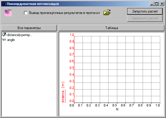 В левой части окна помещен список объектов. Первая строчка в списке – критерий, остальные строчки – оптимизируемые параметры. Список используется для выбора критерия или одного из оптимизируемых параметров. Значения выбранного объекта в процессе оптимизации отображаются в поле графиков, расположенном в правой части окна. При нажатой кнопке Все параметры в поле графиков одновременно отображаются значения критерия и всех оптимизируемых параметров.