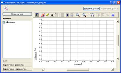 В левой части окна помещен список объектов, разбитый на категории: критерий, цели (оптимизируемые параметры), ограничения-равенства, ограничения-неравенства. Списки используются для выбора объектов, которые в процессе оптимизации отображаются в поле графиков в правой части окна. При нажатии на кнопку Отметить все в поле графиков одновременно отображаются значения критерия, всех оптимизируемых параметров и всех ограничений.