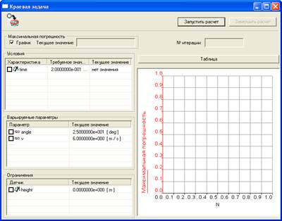 Кнопка Таблица используется для открытия диалогового окна просмотра значений максимальной погрешности. В этом окне также отображаются значения выходных характеристик, варьируемых параметров и ограничений в виде простых неравенств, если они выбраны для отображения. Все они представлены в виде числовой таблицы. В таблице, как и в графиках, значения выводятся в зависимости от номера итерации, выполненной в процессе поиска решения. Описание диалога управления таблицей приведено в подразделе «Таблица показаний датчиков» раздела «Графики датчиков» главы «Работа с окнами» книги «Общее описание программного комплекса».