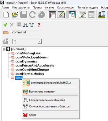 Для выполнения команды в режиме исследования проекта выберите требуемую команду в справочнике проекта, нажмите на нее ПКМ и нажмите на кнопку Выполнить команду (рис. 17).