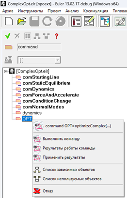 Для выполнения команды в режиме исследования проекта выберите требуемую команду в справочнике проекта, нажмите на нее ПКМ и нажмите на кнопку Выполнить команду (рис. 15).
