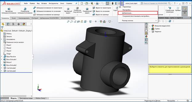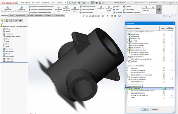 Шаг 1. Открыть контекстное меню кнопки настроек и нажать «Добавления…» (см. рис. 2). Далее в открывшемся окне (см. рис. 3) в разделе «Другие добавления» проставить галочки в двух местах напротив ECT_SW_Plugin. Теперь при последующих запусках SolidWorks конвертер будет автоматически загружаться и всегда будет доступен.
