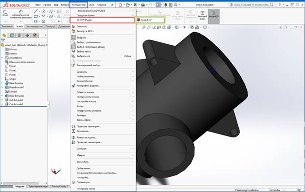 Рис. 4. Выбор инструмента Экспорт в ECT в SolidWorks