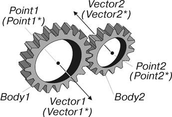 Шарнир описывает зубчатое зацепление двух звеньев (валов) с произвольным расположением осей в пространстве. Общий вид шарнира представлен на рис. 13.Пара имеет пять степеней свободы. Благодаря чему в процессе движения допускаются изменения межосевого расстояния и углов между осями, а также поступательные смещения вдоль осей. При этом передаточное отношение остается неизменным. При создании шарнира задаются точки осей вращения Point1, Point2 и векторы направления вращения Vector1, Vector2 для каждого из звеньев. В модели используются копии этих объектов Point1*, Point2*, Vector1* и Vector2*. Точка Point1* и вектор Vector1* прикрепляются к первому звену. Точка Point2* и вектор Vector2* прикрепляются ко второму звену.